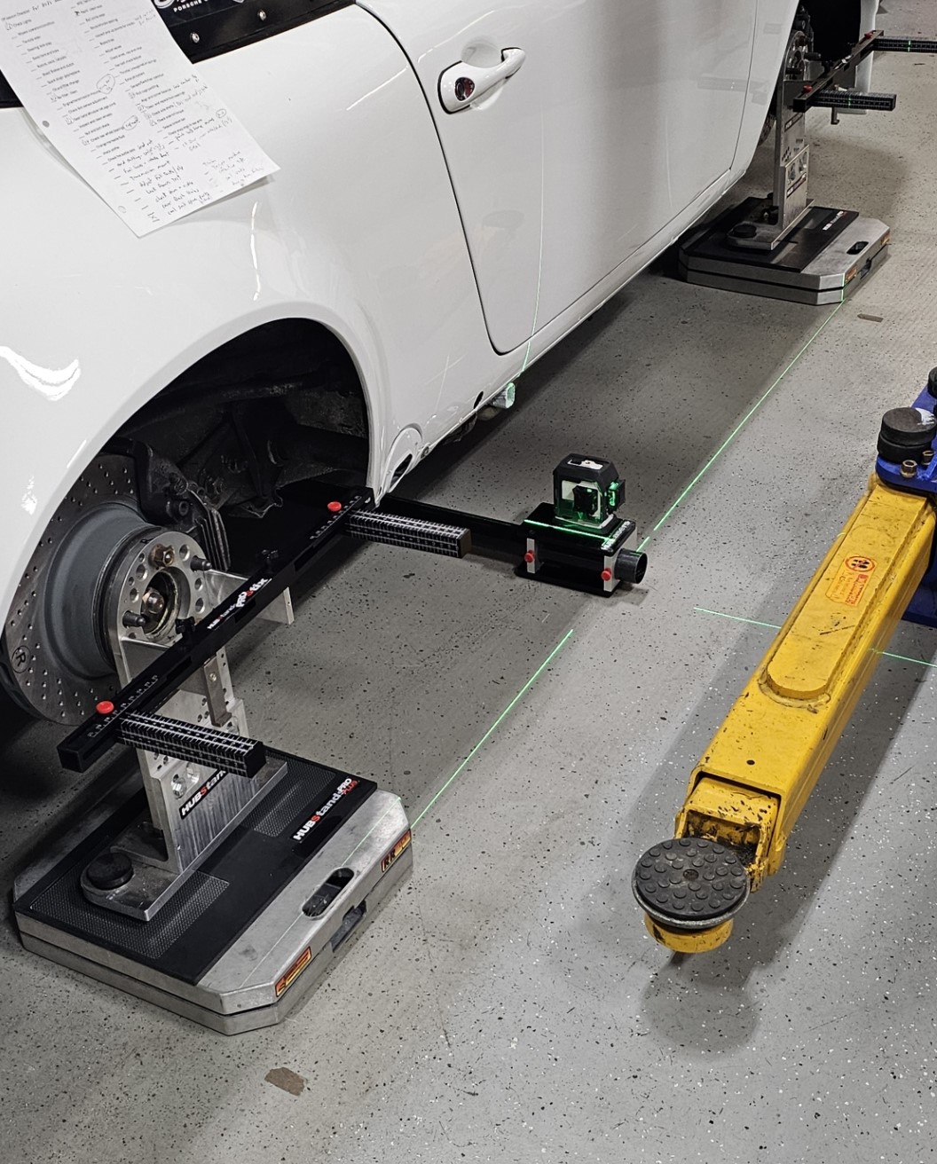 HUBStands LASERStrings replace the old school hanging metal frames and tangled strings with a pair of precision lasers. The HUBStands LASERStrings are a pair of 3 beam green lasers, mounted on machined positioning brackets and attached to a carbon fiber cross chassis tube. The freestanding LASERStrings slide under the car with a laser unit at each end and when positioned perpendicular to the chassis centerline, create a precision beam along both sides of the car. These parallel beams simulteanously illuminate the toe values on each corner of the car.