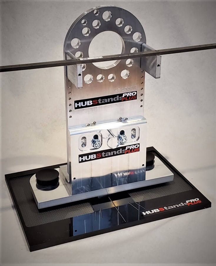 ProPLUS HUBStands are machined from 6061 aluminum and come complete as a set of four with exact height and soffset adjustable roller ball bases, interchangeable, multi-pattern Pro Hub Plates, stainless Toe Sticks and Acrylic/Composite Anti-Roll off Safety Plates.